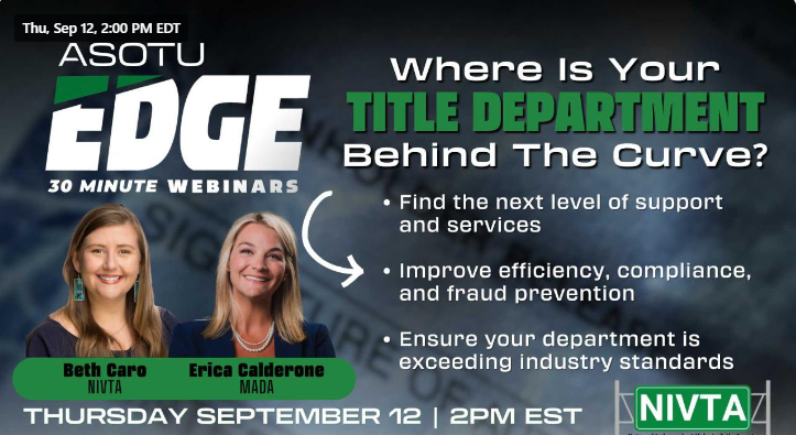 Is your title department struggling to keep up with the evolving demands of the business? This 30 minute ASOTU Edge webinar that will help you identify the areas where your title department may be lagging and how to address these challenges head-on. Kyle Mountsier and Jordan Cox are joined by title expert Beth Caro, President and CEO of NIVTA (National Independent Vehicle Titling Agents Organization) to delve into what a modern title department needs to reach its full potential. In this webinar, you’ll discover: -The common pitfalls that prevent title departments from keeping pace with technological advancements and customer expectations. -Practical strategies for modernizing your department’s processes to improve efficiency, compliance, and fraud prevention. -Insights into how to better collaborate to enhance overall operational success. -Key steps to ensure your department is not just meeting, but exceeding, industry standards and regulations. Don’t let your title department fall behind the curve. Learn how to elevate your support and services to the next level, ensuring your team is equipped to thrive in a rapidly changing industry.